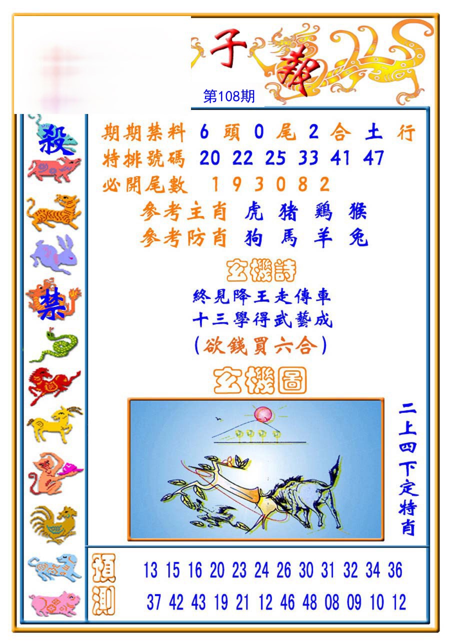 | 108期;【龙鸡兔狗羊鼠牛马虎】开:?00 |